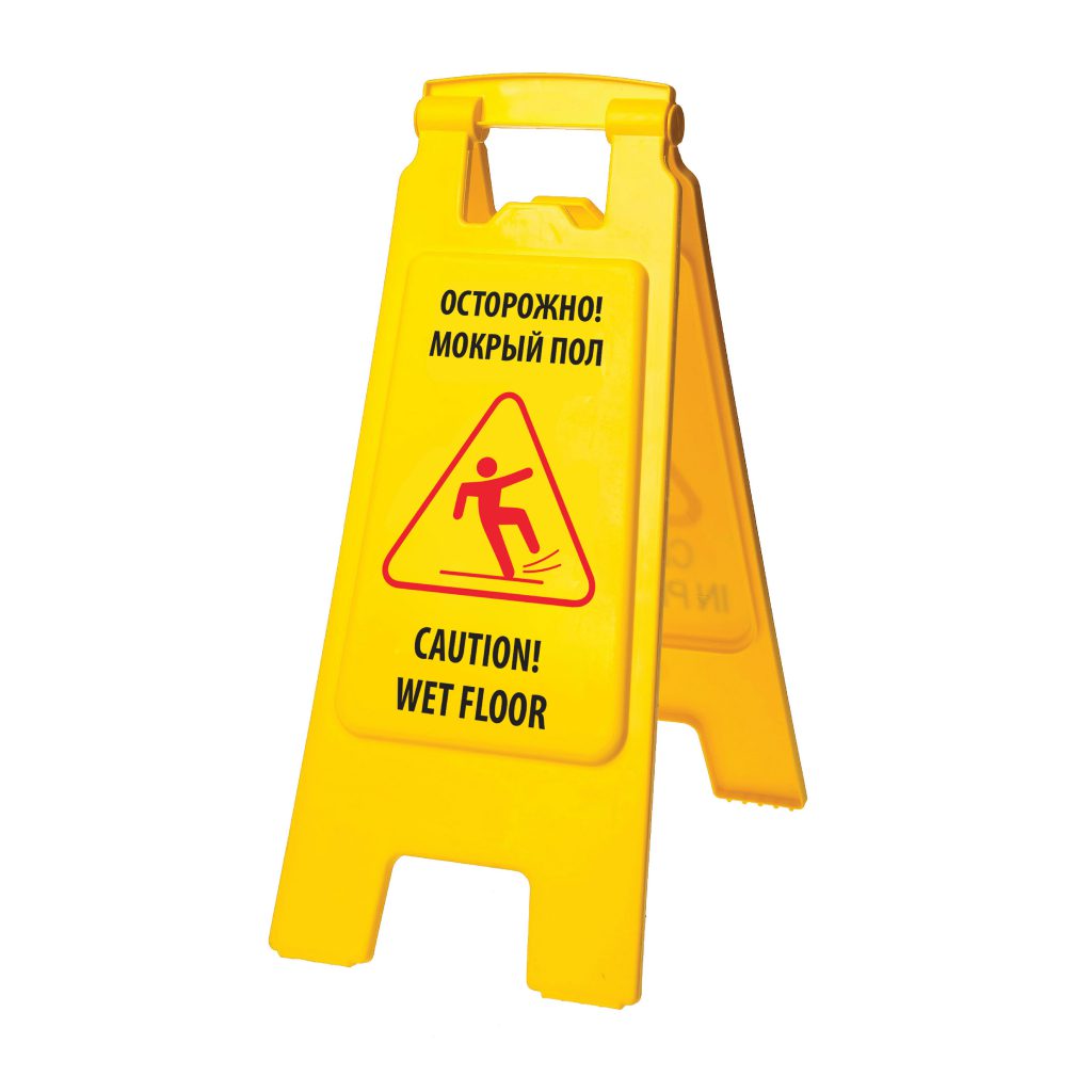 Информация написана на русском и английском языках с двух сторон, что позволяет использовать его в любых респектабельных помещениях. Существует значительное количество различных законов и правил, предписывающих необходимость использования предупреждающих табличек и знаков. Их наличие снижает вероятность получения травм сотрудниками и клиентами.
